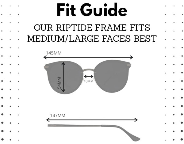 Our Riptide Frame Fits Medium/Large Faces Best. Fit guide measurements shown: 145mm (frame width), 54mm (lens height), 10mm (bridge), 147mm (arm length).